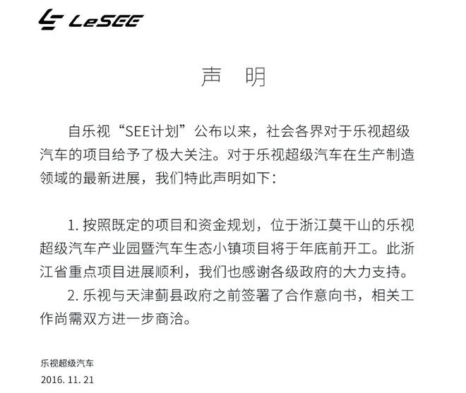 基于不断有消息猜测对于乐视超级汽车的资金困难问题,或导致其相关工厂项目停滞。乐视超级汽车通过官方微博对外发布声明,以下声明全文。