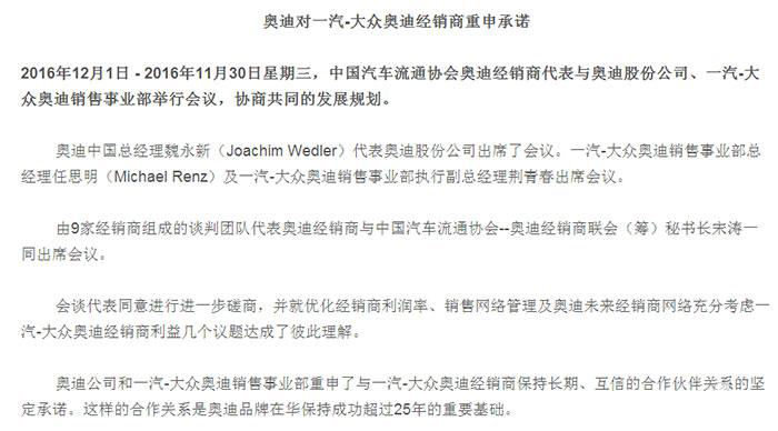 参与此次会议的各方代表同意进行进一步的磋商,并就优化奥迪经销商利润率、销售网络管理及奥迪未来经销商网络充分考虑一汽-大众奥迪经销商利益等几个议题达成了彼此理解。奥迪股份公司和一汽-大众奥迪销售事业部重申了与一汽-大众奥迪经销商保持长期、互信的合作伙伴关系的坚定承诺。
