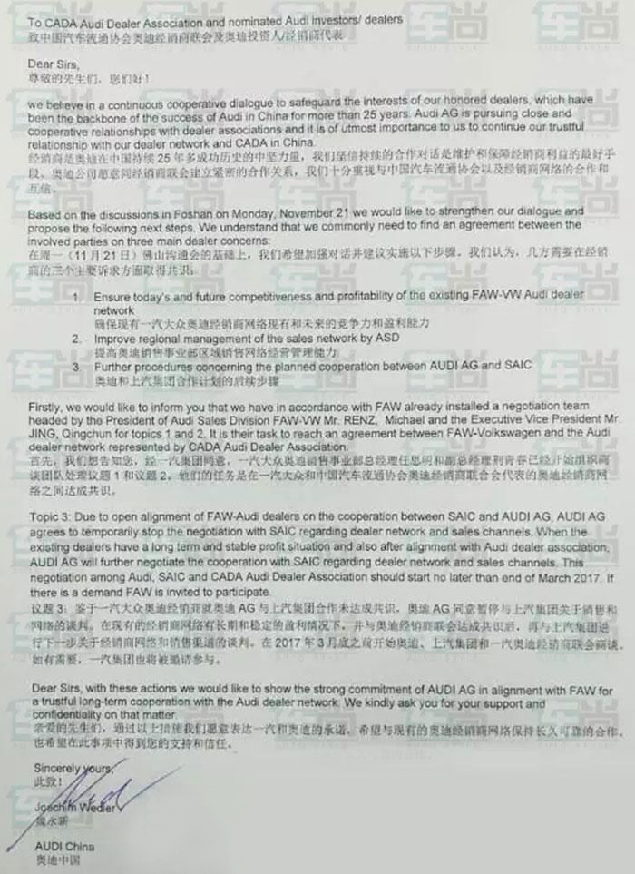 而几乎与此同时,在2016年11月30日下午就传出了奥迪股份公司正式同意暂停与上汽集团关于销售和网络谈判的消息。而相关媒体又发布了一封由奥迪中国总经理魏永新签署的内部绝密文件,在这份内部绝密文件中获悉,在2016年11月21日佛山沟通会的基础上,奥迪经销商与奥迪股份公司、一汽-大众奥迪销售事业部在三个主要诉求方面已经达成了共识。