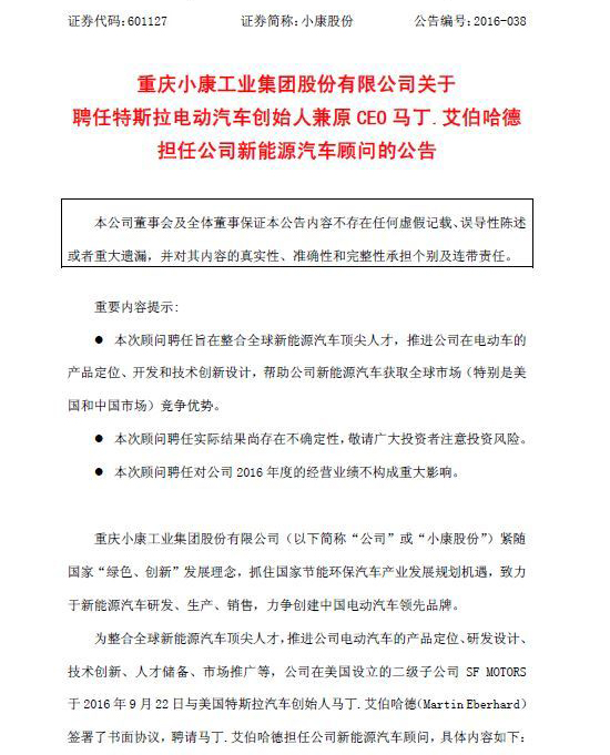 2016年9月28日,小康股份发布公告称,该公司美国新能源子公司SF MOTORS已于当地时间2016年9月22日与与美国特斯拉汽车创始人Martin Eberhard(马丁.艾伯哈德)签署了书面协议,聘请马丁.艾伯哈德担任SF MOTORS公司新能源汽车顾问,“旨在整合全球新能源汽车顶尖人才,推进公司在电动车的产品定位、开发和技术创新设计,帮助公司新能源汽车获取全球市场(特别是美国和中国市场)竞争优势。”