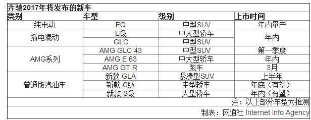 AMG是梅赛德斯-奔驰旗下的高性能子品牌,并推出了众多高性能车型。不仅在性能车方面,在刚刚过去的2016年戴姆勒股份公司也正式提交了旗下全新纯电动车型子品牌的商标注册申请。从戴姆勒公司的规划来看,2017年将全面发展AMG系列性能车以及新能源车型。网通社对今年奔驰即将发布的车型进行了梳理,除AMG GT R、AMG GLC 43、AMG E 63等性能车以外,还有全新EQ纯电动车的量产版以及多款普通汽油版车型。
