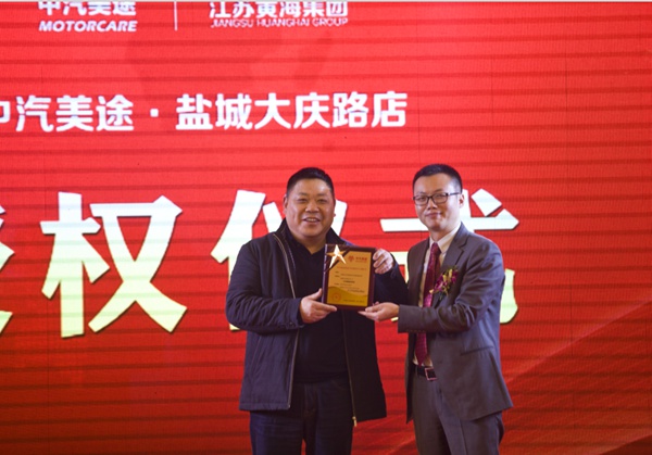 中汽美途运营总监熊云兵先生向中汽美城盐城大庆路店总经理杨明先生授牌