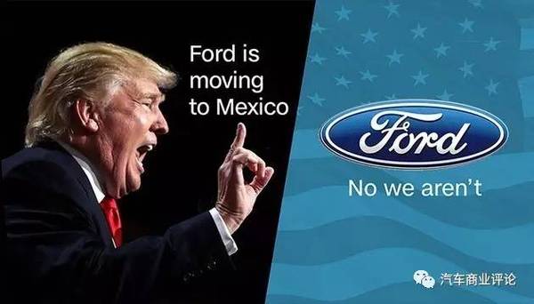 2016年11月大选之前,特朗普已在多个场合中批评福特的墨西哥建厂计划,并威胁要对其销往美国市场的墨西哥制造课以重税。福特发表声明后,特朗普通过社交网络称赞了福特的做法,之后将矛头集中对准通用及丰田。