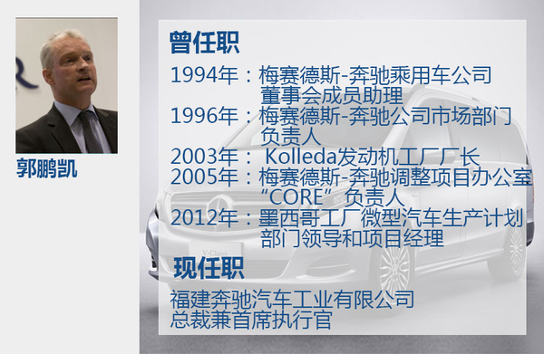 郭鹏凯先生此前任职于戴姆勒墨西哥Aguascalientes的尼桑合资工厂的微型汽车生产计划部门领导和项目经理工作。他从1994年加入戴姆勒集团,在这20多年间,先后在阿根廷负责梅赛德斯-奔驰乘用车、商用车和卡车的市场营销、经销商开发和销售管控等与市场方面相关的工作。随后一直梅赛德斯-奔驰各地的工厂负责技术生产和采购管理等工作,从汽车的生产到销售环节都拥有丰富的经验。