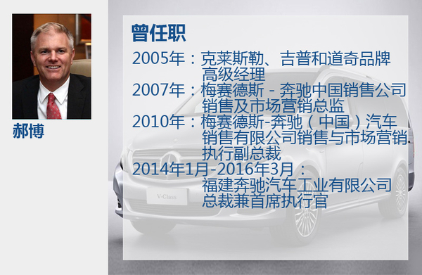 从2014年1月1日至今,郝博先生一直担任福建奔驰汽车工业有限公司总裁兼首席执行官,在郭鹏凯接任后,戴姆勒集团将对他进行新的任命。郝博先生从2007年开始接手中国市场,凭借其在华多年营销经验和对中国市场的了解,他在任期间对福建奔驰商务车业务的发展起到一定的帮助。在2014年福建奔驰完成销量正向增长,同时将全新一代V级引入中国,并针对中国市场做出本地化升级。