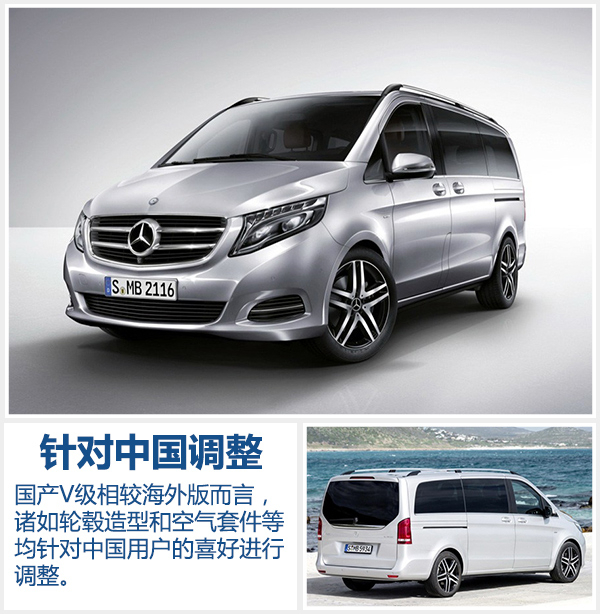 福建奔驰全新一代V级是一款专门为中国消费者需求打造的车型,新车已在国内正式上市共推出V260领航版、V260尊贵版以及V260L尊贵加长版三款车型,全系搭载2.0T涡轮增压发动机。这款国产V级相比海外版在配置上增加了多项全新的豪华配置。另外,国产版全新V级相较海外版本在外观设计上进行了微调,诸如空气套件和轮毂等进行了重新设定,使新车更符合中国消费者的审美需求。(网通社 2016年4月15日 福建报道)
