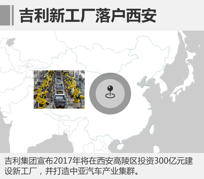 为配合国家一带一路战略,吉利集团宣布将在西安高陵区投资300亿元建设新工厂,并打造中亚汽车产业集群。 未来将借助西安空港新城及西安内陆港的双捷便利陆空运输条件,吉利汽车将抢先占领中亚、俄罗斯和东欧市场的汽车高地。