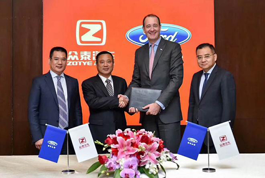 11月8日,众泰汽车与福特亚太汽车控股有限公司、福特汽车(中国)有限公司在北京正式签署合资经营合同,按照各占50%的股份拟在浙江省共建一家中外合资企业。新合资公司将主要生产采用合资公司自主品牌的经济型纯电动乘用车产品,年产量预计在10万辆。