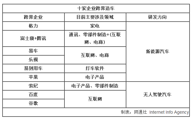 总结:仔细观察不难发现,跨领域进入汽车行业的企业均是在各自领域已取得不小成就的行业巨头,本身拥有充沛的技术及财力资源。自主研发或寻找汽车行业的合作伙伴共同努力,未来能否推出获得汽车市场认可的产品尚不得而知。可以肯定的是,跨界企业将为汽车行业发展注入新的活力,加快汽车产品高科技的应用。