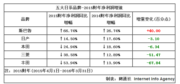 与2014财年净利润回暖和集体猛增相比,日系车市场盈利能力2015年第二、三、四季度到2016年第一季度下滑严重。日前,日系车企公布了2015财年的业绩报告,网通社对丰田、本田、日产、斯巴鲁、三菱五大车企财报进行统计后发现,与2015财年的同期净利润增幅相比,三家日系车企盈利能力全面下滑,出现严重的负增长。这其中仅有日产和斯巴鲁两家日系车企净利润实现正增长,其中日产盈利能力放缓,斯巴鲁则是大幅增长。