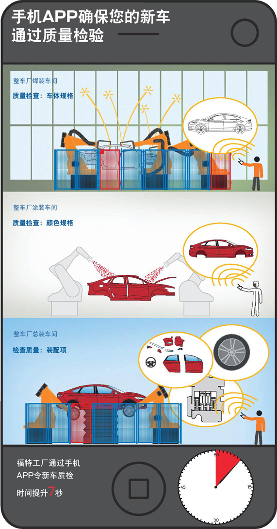 设备通过蓝牙识别装配线上每辆汽车的准确质检指标,并将这些指标显示在手机屏幕上,供装配团队随时跟进并审核。新系统降低了7%的人工误差,同时使每辆汽车的质检时间缩短了7秒。(点击这里,观看福特智能质检设备视频)