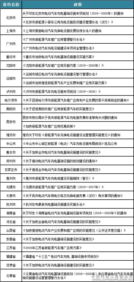 截止到6月份,已经有8个省16个市出台了有关2016年以后新能源汽车充电基础实施规划的政策,覆盖了湖南、河北、山西、安徽、江苏、福建、甘肃及云南8个省,北京、上海、广州、重庆、沈阳、运城、泸州、哈尔滨、西安、潍坊、衡水、郑州、石家庄、惠州、无锡及杭州16个市。