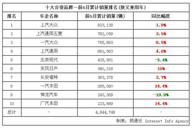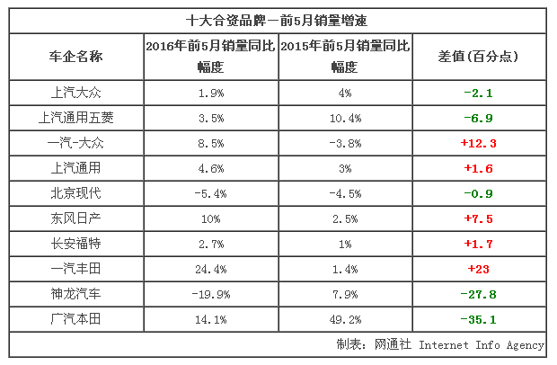 此次统计的十大合资车企中,包括德系合资车企上汽大众和一汽大众,美系合资车企上汽通用、长安福特,韩系合资车企北京现代,法系合资车企神龙汽车,日系合资车企东风日产、一汽丰田和广汽本田。其中德美5月销量增速明显回暖,而在第二梯队中的日系合资品牌出现两极分化的市场表现。