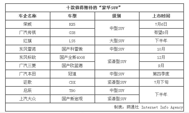 SUV目前已经成为国内销量增速最高的细分市场,加之消费者对SUV车型的概念逐渐深化,这一细分市场的高端产物势必受到国内外车企的大力推进和消费者的追捧。网通社梳理了各大厂商的新车规划后发现,十家车企打造十款专属中国市场的“豪华SUV”,将于今年下半年陆续上市,目前这十款新车代表其SUV产品的最高水平。