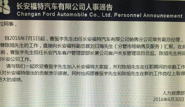 以下为长安福特汽车有限公司人事公告截图: