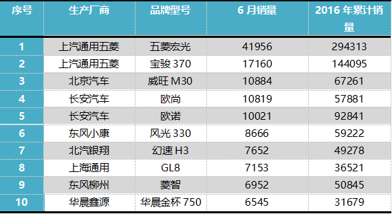 具体排名如下:2016年6月MPV销量排行榜:五菱宏光继续保持着强劲的增长势头,6月销量高达41956辆,不仅蝉联本月MPV销量冠军,更是力压轿车之王大众朗逸和SUV之王哈弗H6,成为本月乘用车销量冠军,宝骏730的形势不容乐观,本月销量只有17160辆,虽然成功保住了亚军的地位,但是同比下滑20.2%。