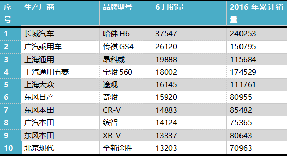 2016年6月SUV销量排行榜具体排名如下: