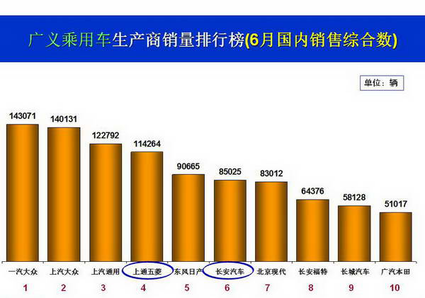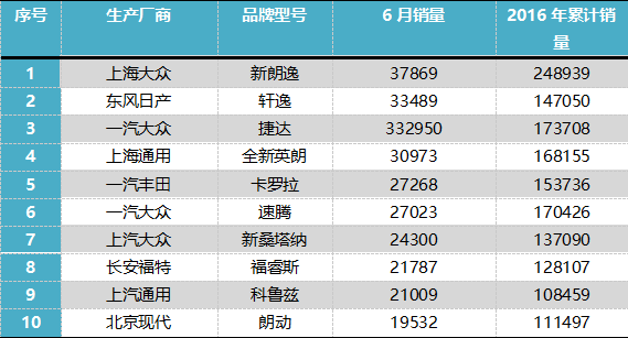 2016年6月轿车销量排行榜具体排名如下: