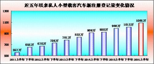 汽车保有量达1.84亿辆,新登记1328万辆。随着群众机动出行需求不断提高,汽车市场潜力持续释放,汽车保有量保持快速增长趋势。上半年汽 车保有量净增1135万辆,新注册登记汽车达1328万辆,比去年同期提高199万辆,同比增长17.62%。从统计情况看,近五年以来,汽车新注册量呈 高速增长趋势,汽车占机动车比率不断提高,从43.88%提高到64.39%。从分布情况看,全国有46个城市的汽车保有量超过百万辆,其中北京、成都、 深圳、重庆、上海、苏州、天津、郑州、西安、杭州、广州、武汉、石家庄、南京、青岛、东莞16个城市汽车保有量超过200万辆。