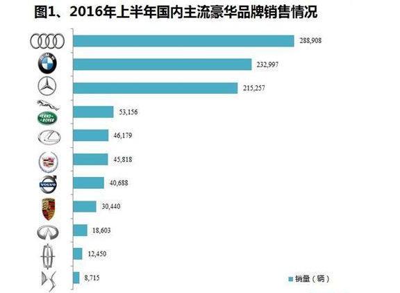 具体来看,一线豪华品牌依旧把持绝大部分市场,德系三强2016年上半年在华销量均在20万辆以上,合计737,162辆,占据豪华品牌7成以上的份额。