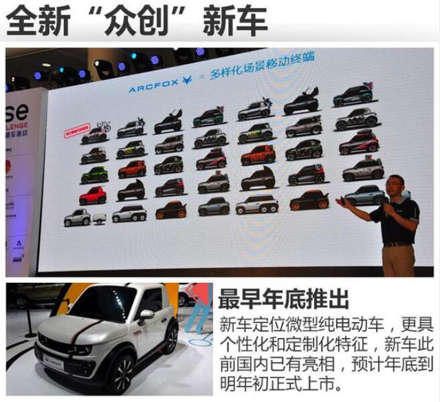 除了ARCFOX品牌外,7月30日在北京汽车产业研发基地成功举办的《北京青少年未来能源车挑战首届全国赛》中,郑刚还表示将在8月30日发布全新“众创”品牌。而这一品牌将汇聚互联网力量,打造定制化微型电动车。他提到:“今年年底、明年年初,如此五彩斑斓的车型,就将诞生在未来的这里。”