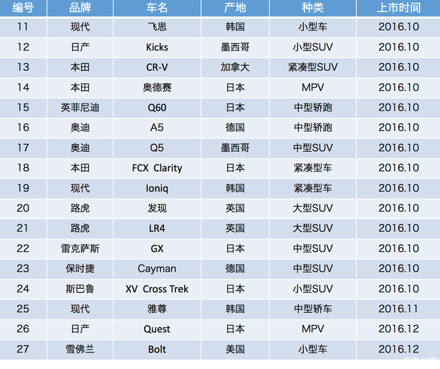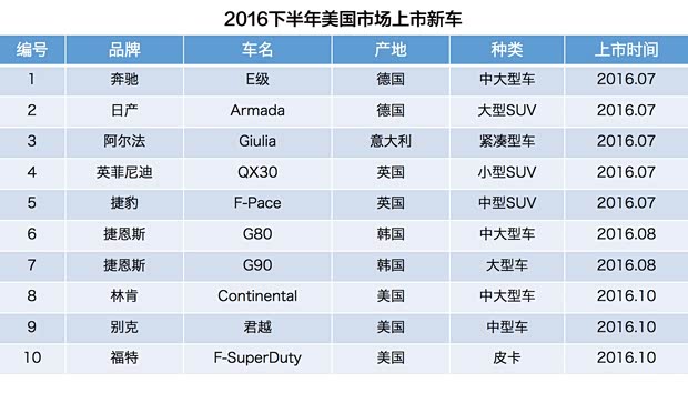 从2016年下半年上市的新车型可以看出,小型车,紧凑型车比较少。大部分依然是尺寸较大的车型。并且原产地美国的车型不多,大部分都是海外进口。