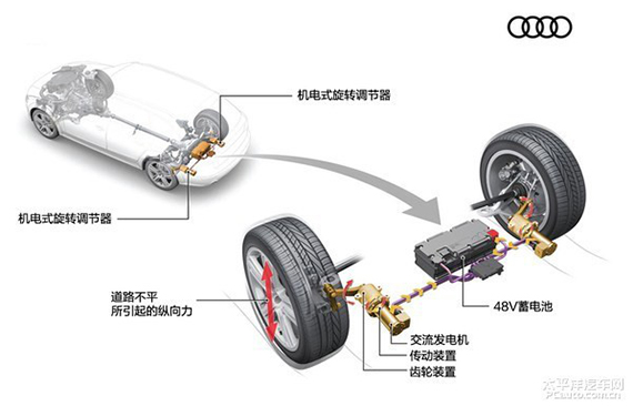 奥迪采用了一种特别研发的叉臂来收集悬架在上下颠簸所产生的动能,通过传递装置将动能导入电机,由发电机发电,再通过蓄电池,将电能以化学能形式储存起来。它与48V的电池协同工作,在需要的时候为车上的用电设备提供用电,从而减少机械损失,降低油耗。