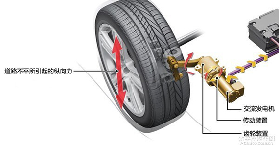 eROT系统由交流发电机、齿轮单元以及将齿轮单元与轮毂架连接起来的连杆构成。在连杆收到轮毂传来的上下方向的运动时,齿轮装置将上下运动转化为旋转运动,然后通过传动装置将动能传到电机,由交流发电机将该旋转运动转换成电力。