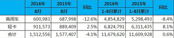 AutoData 近日发布,8月美国新车销量1,512,556辆,同比下降4.1%。其中乘用车销量同比下滑12.6%至600,983辆。轻卡销量911,573辆,同比增长2.5%。