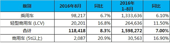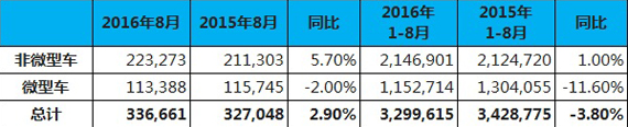 根据日本汽车经销商协会公布的数据,日本2016年8月份新车销量336,661辆,同比增长2.9%。其中非微型车销量223,273辆,同比增长5.7%;微型车销量113,388辆,同比下降2.0%。