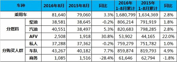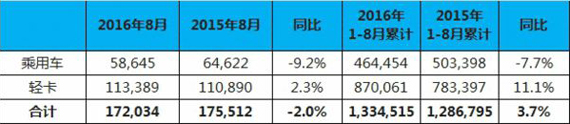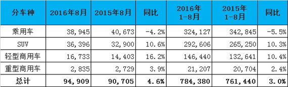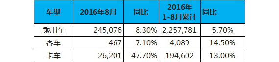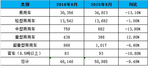 据南非汽车制造商协会发布的最新消息,2016年8月南非汽车销量46,146辆,同比下降9.49%。其中乘用车销量30356辆,同比下滑13.1%;轻型商用车销量13542辆,同比下降-1%;中型商用车销量759辆,同比下滑13.9%;重型商用车销量438辆,同比增长12.9%;超重型商用车销量968辆,同比下降4.8%;8.5吨以上客车销量83辆,同比增长10.8%。