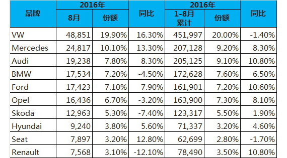 德国8月份乘用车销量24.5万辆 同比增8.3%