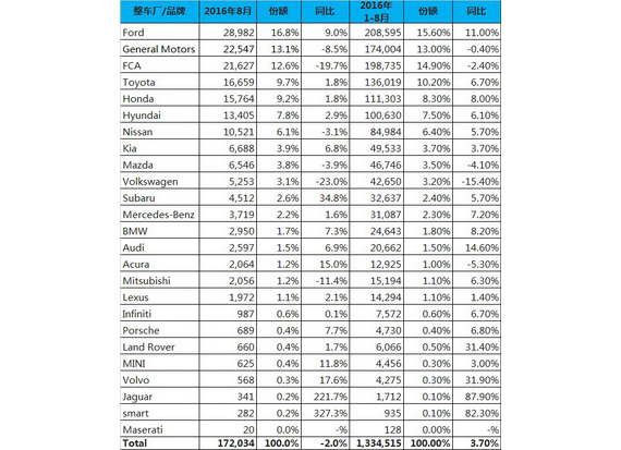 美国三家本土企业中,通用汽车8月销量256,429辆,同比下降5.2%,占市场份额17.0%;福特的销量下降8.8%至213,411辆,占市场份额14.1%;菲亚特克莱斯勒汽车销量同比下降2.4%至196,756辆,占市场份额13.0%。