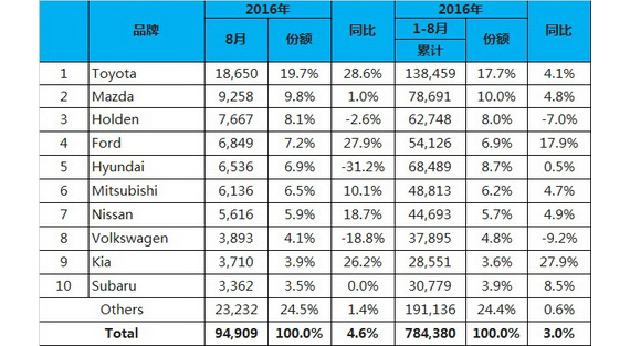 澳大利亚8月新车销量9.5万辆增长4.6%