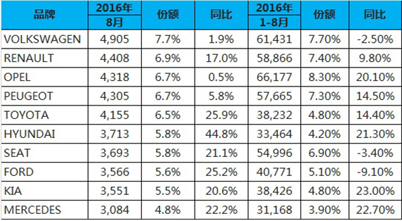 从分品牌来看,8月份意大利国内整车厂的乘用车合计注册量20,862辆,同比增长24.71%,占市场份额的29.15%;国外整车厂合计注册量50,714辆,同比增长18.33 %。