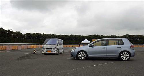 在测试公路上的演示假设的情况是,当自己车进入视野差的十字路口时,从右边驶来车辆。自车以低速进入十字路口,此时右方有车辆要从眼前经过,横穿马路,如果继续前进,就会撞到右侧来车的侧面。不过,24GHz频带雷达提前检测到右边来车,自动刹车系统启动,自车停下,正在过马路的车辆继续从车前驶过。