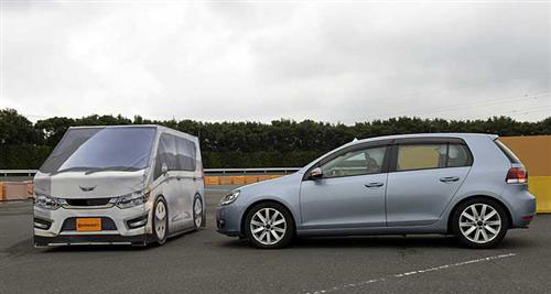 测试中使用的车辆是大众的“高尔夫”,在前保险杠的侧面内侧安装了24GHz频带雷达。ACC(自适应巡航控制)及自动刹车系统使用的普通毫米波雷达的检测距离长达200m左右,但可检测的角度只有90度左右,因此很难检测到从左右方向驶来的车辆。因此,装在保险杠上的24GHz频带雷达选择了可检测角度达到150度的产品。虽然检测距离只有60m,但可检测到广大范围内的障碍物,因此只需在左右各安装1个即可。