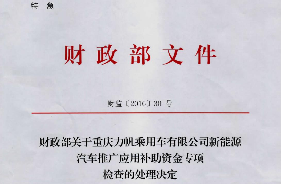 针对上述问题,财政部决定对力帆乘用车上述2395辆新能源汽车不予补助,并取消该公司2016年中央财政补助资金预拨资格的处罚。