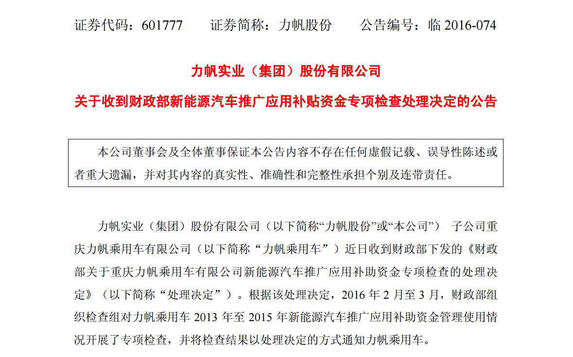 但是力帆股份针对网络上流传关于力帆乘用车骗补的报道发布澄清公告,称公司不在财政部曝光的5家新能源汽车骗补企业之列,此外暂未收到其他相关通知,目前生产经营情况正常。而这次的处理结果坐实了力帆骗补的事实。